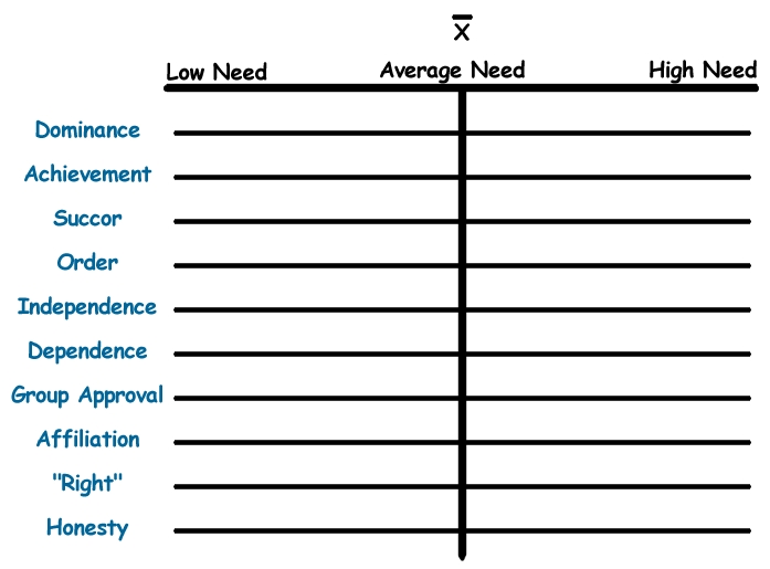 This is how we'll build the picture and graph Jeff's learned needs. We'll list ten learned needs in a column on the left-hand side of the page. We could list more, but ten will serve our purposes. Next to each listing is a line representing the possible range of strengths of the needs found in the general population. If Jeff has a need with a relatively low strength in comparison to the overall population, we'll plot it on the left. If he has a need with a relatively high strength in comparison to the overall population, we'll plot it on the right. And if he has a need that is average, we'll plot it near the middle of the graph.. Then we'll connect the dots and this will be Jeff's unique learned need structure.